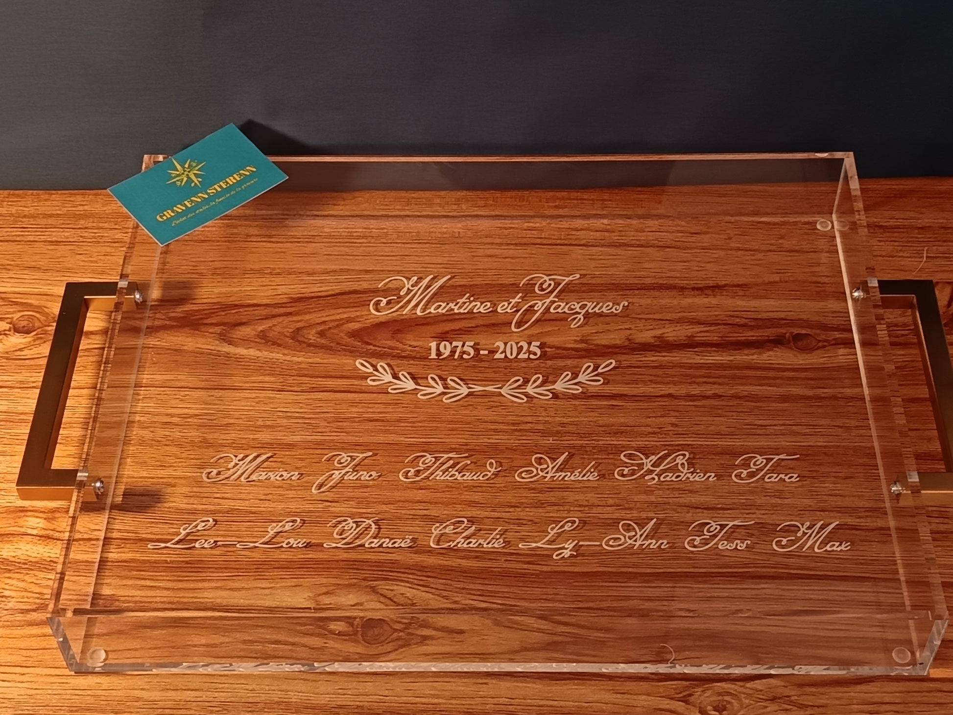 Description : Un magnifique plateau de service en plexiglas gravé… ses poignées dorées lui donnent un côté très chic et raffiné, vous avez là le cadeau original par excellence pour de très nombreuses occasions. Pour gâter une maman, une grand-mère, une famille,… Pour offrir comme cadeau de mariage, de fiançailles, d’anniversaire de mariage, de pendaison de crémaillère,… ou tout simplement pour vous faire plaisir !